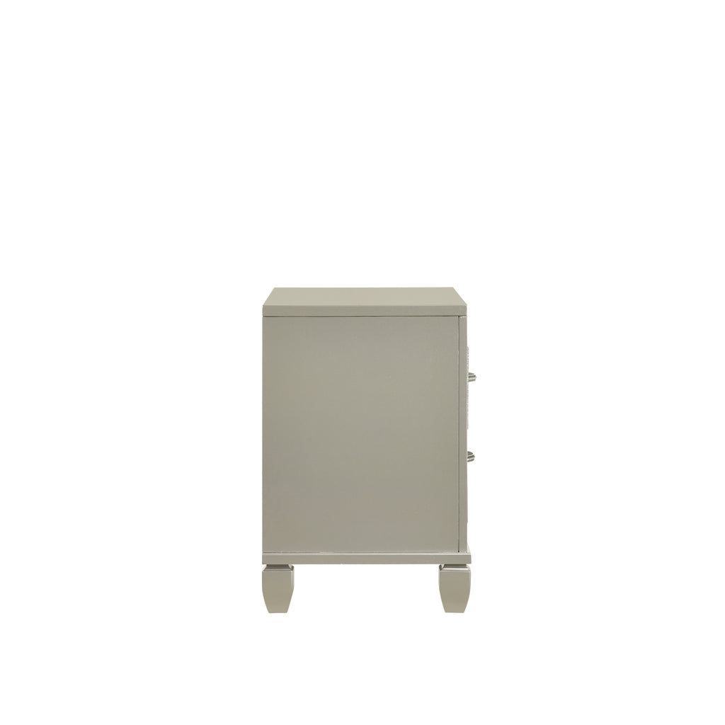 Discover the Radiance Platinum Silver Two Drawer Nightstand, a perfect blend of quality construction and luxurious finish. Crafted from a combination of Solid Rubberwood and manufactured woods, this nightstand offers ultimate stability and durability. The semi-gloss lacquer Platinum Silver finish provides a silky, modern framework to this eye-catching collection. Glamorous details such as Glossy textured inlays and mylar trim frame the drawers, which showcase a crushed crystal look decorative laminate front, topped by brushed chrome finish handles with inset crystal accents. The heirloom-quality English dovetail drawers operate smoothly on full extension glides, with finished interiors providing snag-free storage. The top drawers have felt lining, offering added protection for your jewelry, watches, or glasses. Add a glamorous appeal to your bedroom with the Radiance Nightstand.