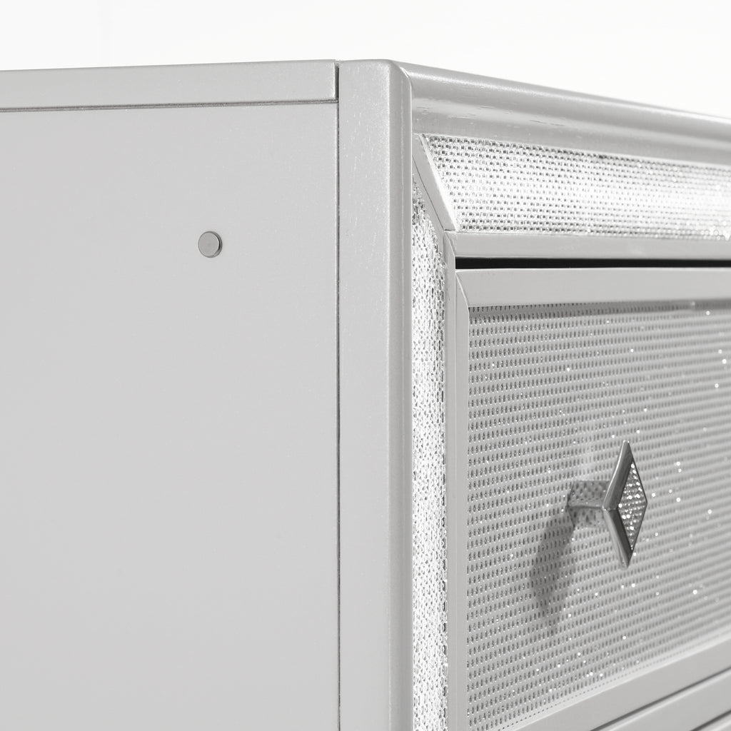 Introducing the Stardust Chest, a captivating piece designed to bring a touch of modern luxury to your bedroom. Crafted with meticulous attention to detail, this chest is constructed from durable manufactured wood, featuring an eco-friendly decorative laminate and UV coating for enduring quality. The sleek white finish is elegantly complemented by glamorous silver accents, adding a dose of sophistication to your space. Adorned with sparkling Poly/Cotton fabric and shimmering crystal hardware, this chest exudes opulence and charm. Illuminate your room with the integrated LED lighting, accentuating the captivating style of this exquisite piece. Inside, the drawers are thoughtfully designed with English dovetail joinery, full extension glides, finished interiors, and felt-lined top drawers, ensuring both beauty and functionality. With diamond-style accents, silver mylar trims, and accent lighting, the Stardust Chest is the perfect choice for those seeking unparalleled sophistication and style in their bedroom decor.