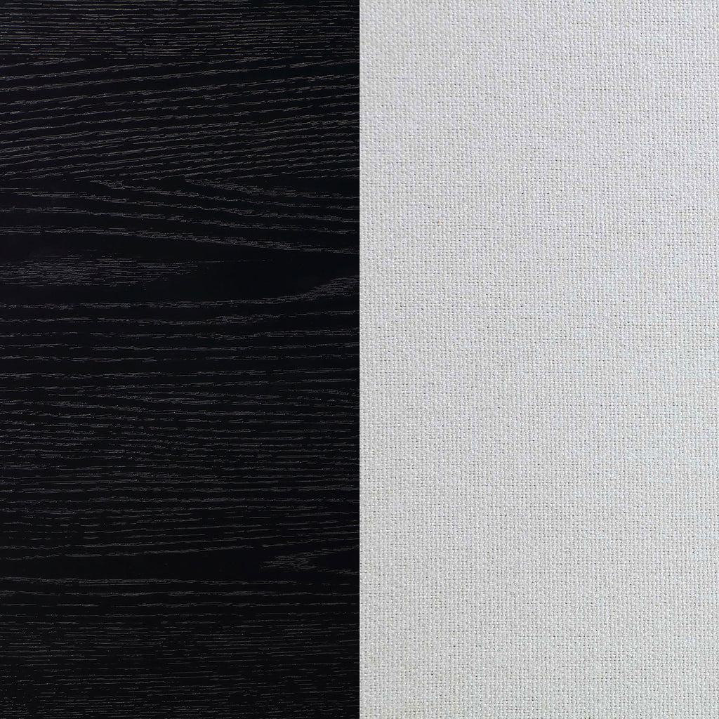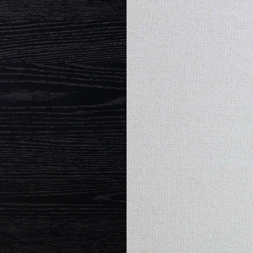 Inspired by trending interior design aesthetics increasingly mixing modern and traditional elements to invent its own style, this five-piece wood dining set stands out to impress. Crisp, clean style and a contrasting color and finish palette begin the dramatic look of a set suitable for both modern and transitional settings important to your everyday living. Distressed black finish wood construction on all pieces gains attention to a minimalist table design with straight, flat leg sections under a sleek top with linear silhouetting and a dimensional top chamfer curving along its edges. Chairs offer a clean silhouette with black finish wood framing, tapered legs, and ornate notched tops with linear carvings thrown in for extra dimension. Soft ivory fabric upholstery is intriguingly placed on both sides of top cushions and over a padded seat. Key Features: • Modern or transitional spaces embrace a five-piece dining set with a simple motif and contrasting finishes/colors • Contemporary style weaves together linear silhouetting in a table with slight top chamfer curving • Black finish wood construction with wire brush distressing is bold, versatile, and textural • A convenient removable tabletop leaf extends length by 18 inches to accommodate a larger party • Chair design features a bordered look with contrasting black wood finish and soft ivory upholstery • Crisp geometric chair top emblems add a textural look with vertical grooves and notched edges