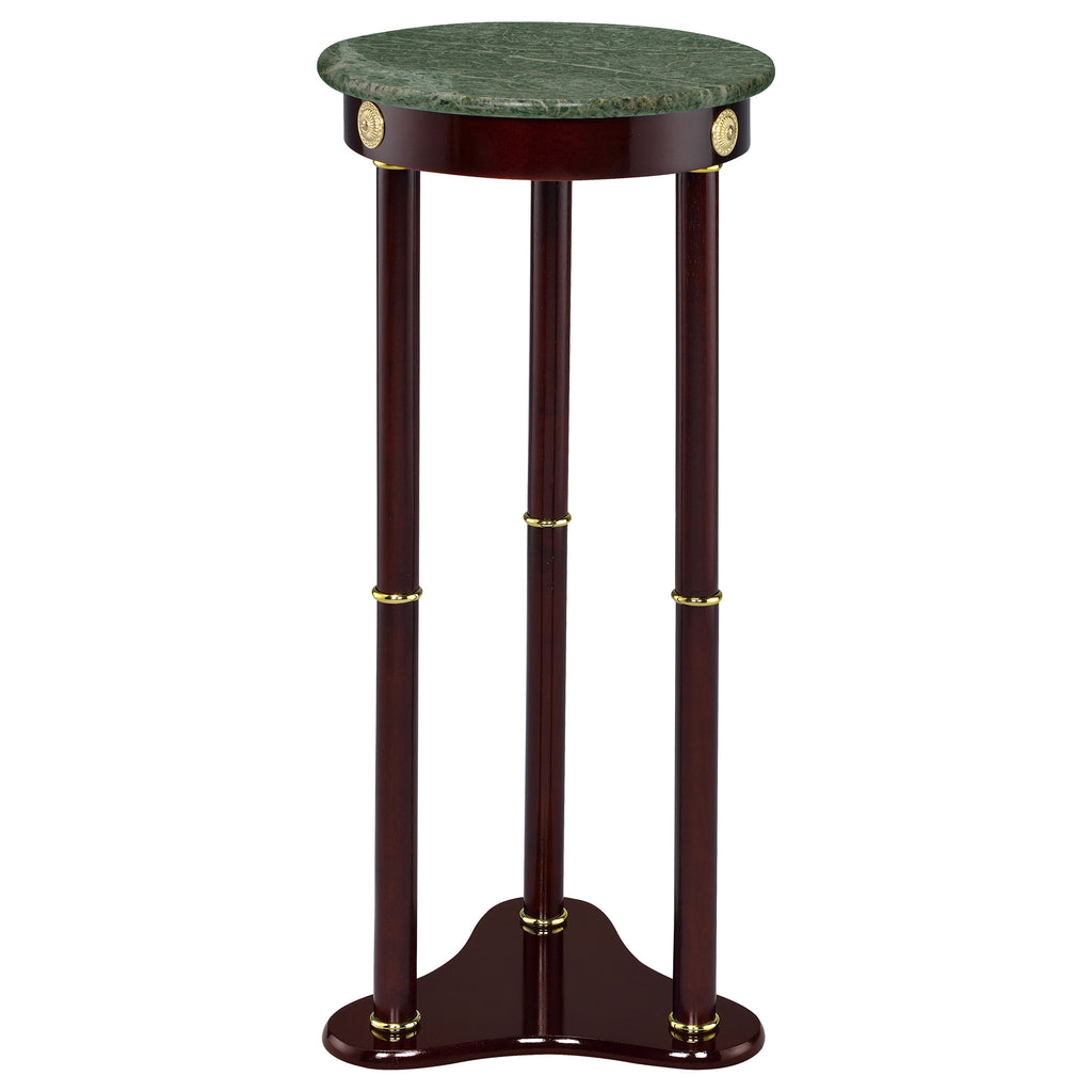 Add a refined touch to any room with this elegant accent table, ideal as a decorative stand or pedestal. A polished green marble top introduces organic texture and visual contrast, while the deep brown wood base provides classic warmth. Gold-tone accents elevate the traditional aesthetic, making it a charming fit for formal living spaces, hallways, or entryways. Built with solid and engineered wood, this compact piece blends timeless design with long-lasting quality. Key Features: • Featuring a genuine green marble top for a luxurious natural accent • Durable solid rubberwood and engineered wood frame ensures lasting quality and strength • Classic round design with gold accents offers a timeless and sophisticated appeal • Sturdy tri-leg base provides reliable stability and support for various uses • Perfect as a plant stand or accent table, blending style and practicality effortlessly • Finished in a rich brown tone to enhance its classic and versatile aesthetic
