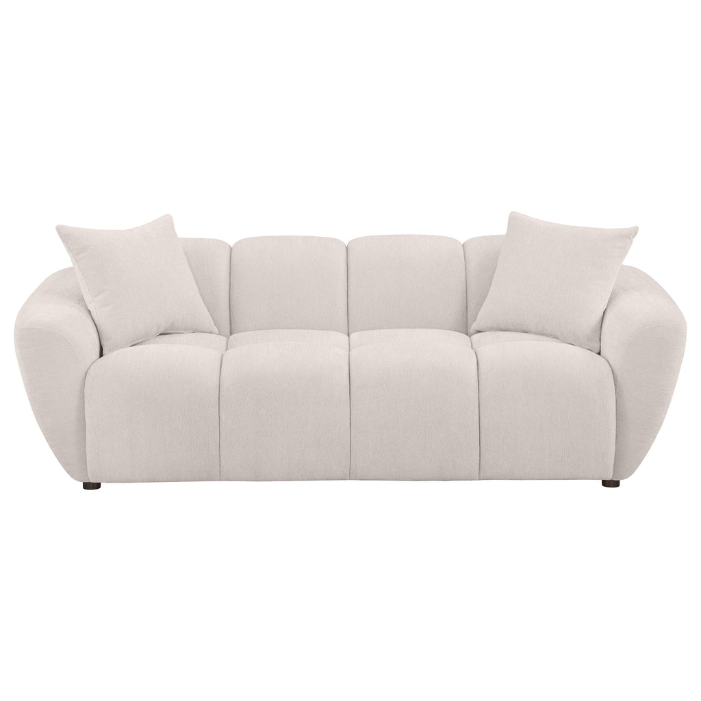 Bold and sculptural, this modern sofa showcases wide splayed arms that frame a grid-tufted silhouette with striking definition. Upholstered in textured greige chenille, its block-like contours are accentuated by deep channel detailing and an attached waterfall seat. Pocket coil construction offers lasting support beneath plush foam padding, while matching knife-edge accent pillows add a tailored finish. This piece blends comfort and statement design in one elevated lounge essential. Key Features: • Sculptural sofa with splayed arms and grid-tufted profile wrapped in textured greige chenille • Attached waterfall seat features pocket coil construction for supportive everyday comfort • Block-like contours and deep channeling emphasize the chunky, modern silhouette • Includes matching knife-edge accent pillows for added comfort and tailored contrast • Chenille fabric upholstery is soft to the touch with subtle tonal texture and visual depth • Constructed from plywood, rubberwood, and foam for a well-balanced foundation
