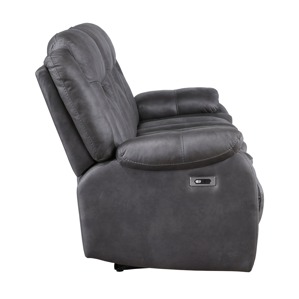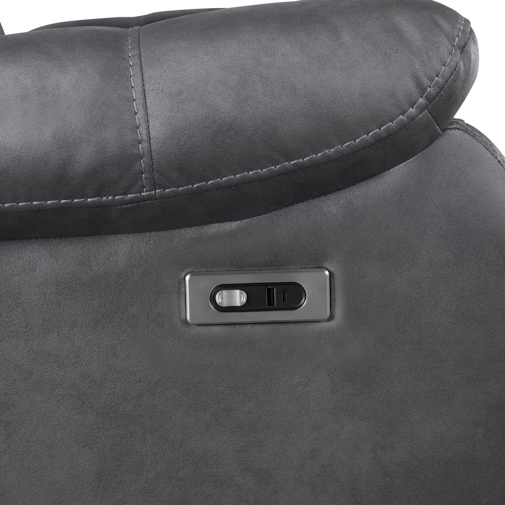 The Morello Power Recliner Sofa in gray is a perfect addition to your living space, combining comfort, style, and modern functionality. This power couch is upholstered in sumptuously soft 100% polyester fabric in a gray color, mimicking the luxurious look of leather without the higher price tag. The Morello Set features double-stitch detailing, adding durability and a sophisticated touch. Plush, overstuffed arm, seat, and back cushions are contoured to enhance overall comfort, ensuring a relaxing experience. Fully upholstered chaise recliner footrests allow you to find your most restful position with the touch of a button. Built with hardwood and manufactured wood frames, coil spring cushions wrapped in resilient foam and polyester, and no-sag seat suspension, this sofa promises years of enjoyment. The casual, transitional style, with its leather-look upholstery and overstuffed cushioning, creates a comfortable, lived-in ambiance. Conveniently, USB-C ports are included in the power switch to keep your devices charged, adding a modern touch to this exceptional piece of furniture. The Morello Power Recliner Sofa offers a perfect blend of practicality and luxury, making it a smart choice for any home.