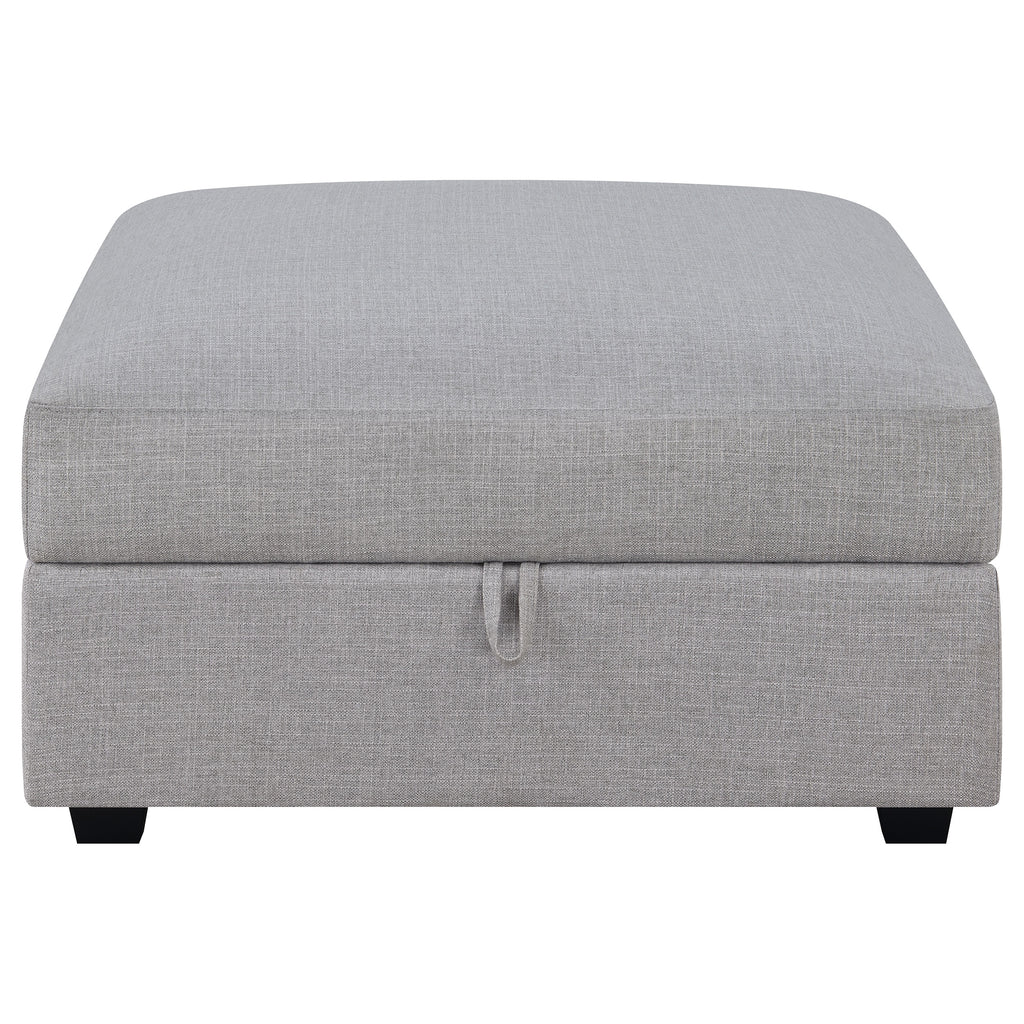 This storage ottoman combines sleek modern design with functional versatility for the living room. Upholstered in soft grey fabric, it features clean lines and a spacious hidden compartment for storing blankets, pillows, or daily essentials. Designed to pair seamlessly with modular sectional components or stand alone as a plush footrest, it offers exceptional flexibility. Feather-down wrapped cushioning and solid wood legs provide lasting comfort and support, blending practicality with refined contemporary style. Key Features: • Modern storage ottoman in soft grey fabric combines sleek form with everyday function • Hidden compartment offers space for blankets, pillows, or daily living essentials • Plush feather-down wrapped cushioning provides comfort and inviting softness • Clean silhouette complements both modular sectionals and standalone arrangements • Crafted with solid wood legs and a reinforced frame for durable long-term use • Versatile as a footrest, extra seat, or modular extension within a living room setup