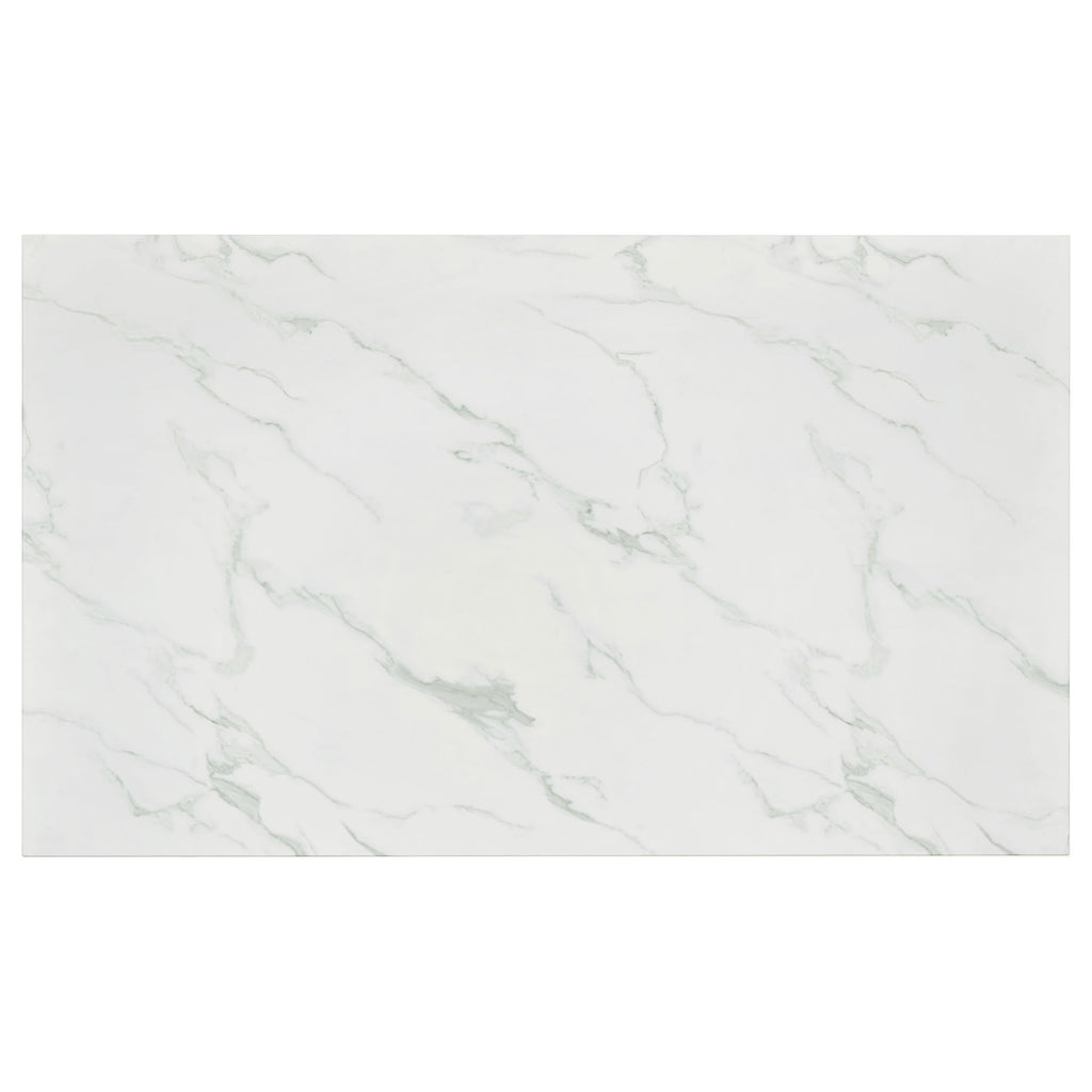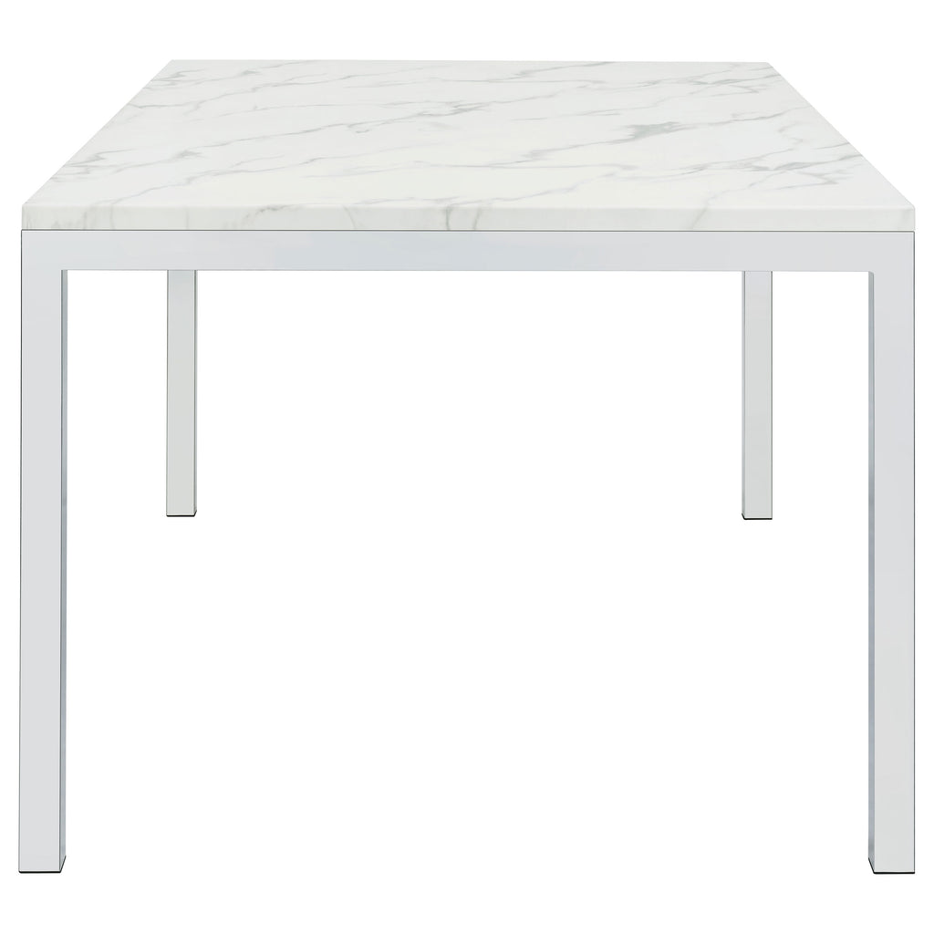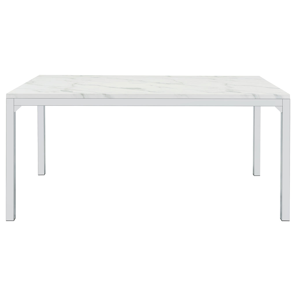 Dress up a dining room with striking, modern opulence. This gorgeous, contemporary dining table flaunts a smooth, white, marble top for a luxurious design that's sure to impress. The table base is made with top-quality metal in a gleaming chrome finish that shines in the light. From everyday dinners to elaborate feasts, the rectangular surface provides all the space you need for family dining enjoyment. Surround this modern table with your favorite chairs to complete a formal dining room in style. Key Features: • Rectangular dining table with spacious top and modern linear frame design • Faux Carrara marble finish adds a refined look with subtle veining across the surface • Sleek chrome metal legs provide sturdy support with high-shine appeal • Clean edges and minimalist profile complement contemporary dining spaces • Made from engineered wood with durable PVC laminate and metal framing • Assembly required with smooth finish ideal for both casual meals and formal occasions