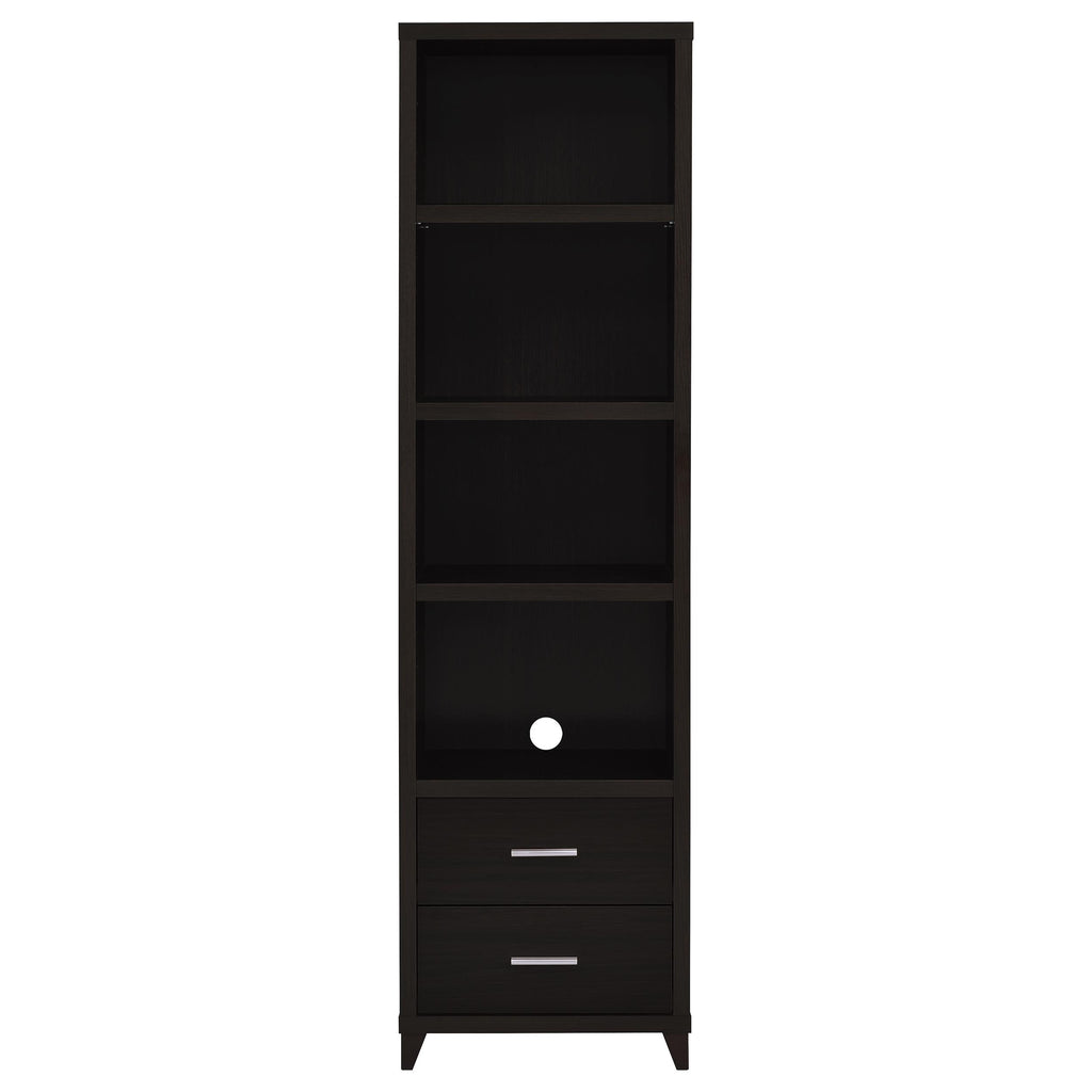 Elevate your entertainment area with this versatile media tower, designed with sleek lines and a cappuccino finish for contemporary appeal. Four open shelves provide ample space to display books, decor, or media devices, while adjustable shelving adds flexibility for customized storage. Two spacious drawers at the base keep accessories neatly tucked away, complemented by brushed silver hardware for a modern touch. Supported by tapered legs, this tower combines practical function with a stylish silhouette to complete your living space._x005F_x000D_ Key Features: • Cappuccino media tower with modern silhouette and brushed silver hardware accents • Four open shelves provide ample space for books, decor, and media accessories • Adjustable shelving offers flexible storage options for customized organization • Two lower drawers add concealed storage for remotes, games, or essentials • Constructed from engineered wood with scratch-resistant laminate veneer finish • Euro drawer glides and tapered legs ensure smooth function and lasting durability