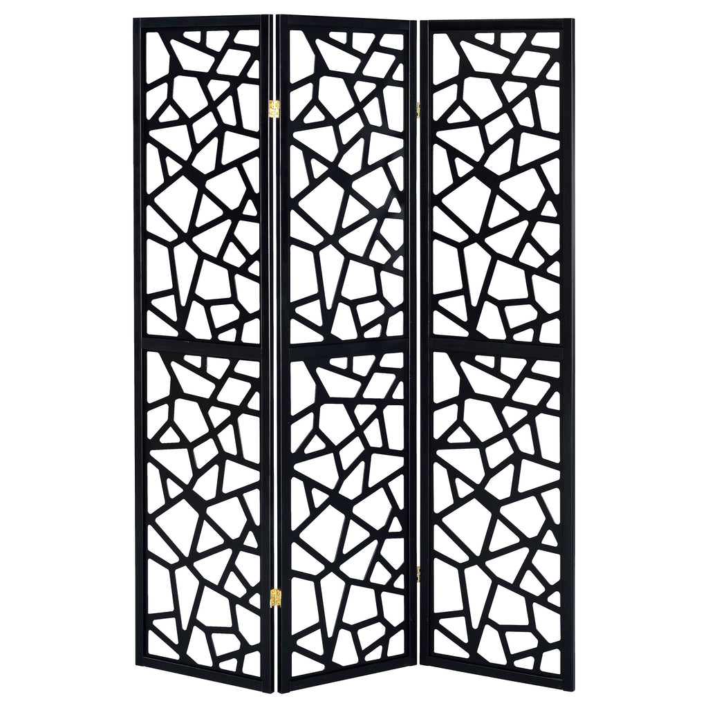 Make a bold statement in any space with this 3-panel room divider, featuring an eye-catching mosaic cutout pattern that enhances modern and mid-century décor. The sleek black finish creates a striking contrast, while the open geometric design allows light to pass through, maintaining an airy and spacious feel. Crafted with a durable solid wood frame, this partition is perfect for separating spaces, adding privacy, or serving as a decorative accent. Its folding trifold design offers versatility, making it easy to reposition as needed. Key Features: • Three-panel room divider with a bold open mosaic pattern for modern appeal • Sleek black finish enhances contemporary and mid-century décor • Trifold folding design allows for flexible room separation and styling • Crafted with durable engineered wood and FSC-certified pine for stability • Ideal for privacy, open-space definition, or as a stylish decorative accent • Light-filtering cutout pattern maintains an airy and open feel