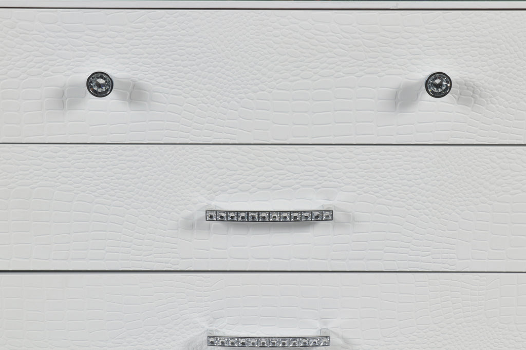 - Glitz and Glam Details: Gleaming White finish, mirrored trims, crystal studded drawer pulls and alligator embossed inlays evoke a Hollywood glam appeal.