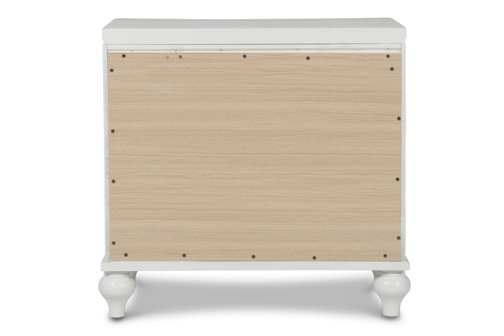 The Valentino 3 Drawer Nightstand in White is a luxurious addition to any bedroom. Crafted from a blend of manufactured and solid woods, it is built to last while maintaining its distinctive appeal. Its glamorous design includes a gleaming White finish, mirrored trims, crystal-studded drawer pulls, and alligator-embossed inlays, embodying the essence of Hollywood glamour. In addition to its stylish appearance, this nightstand offers practicality with its thoughtful details. The heirloom-crafted English dovetailed drawers boast finished interiors to prevent snags and roll smoothly on full-extension ball-bearing glides, ensuring easy access to your belongings. This nightstand provides an abundance of storage with its three spacious drawers, making it perfect for keeping bedside essentials organized and within reach. With its combination of durability, elegance, and functionality, the Valentino 3 Drawer Nightstand is a must-have piece for creating a glamorous bedroom retreat.