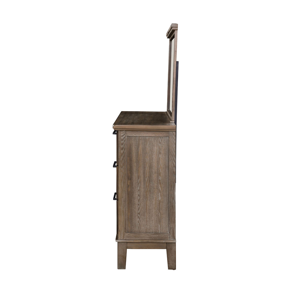 The Cagney Dresser Mirror in Brown is a masterful blend of durability, timeless charm, and functional elegance, making it a perfect complement to any bedroom. Meticulously constructed from solid Rubberwood, premium engineered woods, and authentic Acacia wood veneers, this mirror is designed to last while preserving the natural warmth and beauty of the wood. The multi-step finish in rich tones of brown and gray, hand-rubbed to perfection with a delicate light glaze, enhances the intricate, aged details, evoking a sense of heritage and enduring craftsmanship. The gently rounded corners and expertly distressed accents add character, making this piece both visually appealing and built to last. The mirror features wide moldings that encase crystal-clear, low-distortion beveled glass, providing a flawless reflection that enhances the sophistication and elegance of any space. Whether paired with the matching dresser or used on its own, this mirror is a standout addition to your home decor.